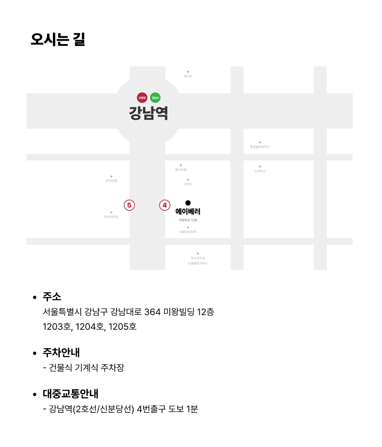 강남역(2호선/신분당선) 4번출구 도보 1분