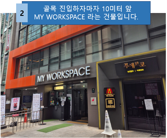 3. 밀회관을 오른쪽으로 끼고 좁은 골목 들어오면 이베리코 식당 옆에 MY WORKSPACE 라는 건물 입구가 보이며 해당 건물 엘리베이터로 9층으로(로비) 오시면 됩니다.
