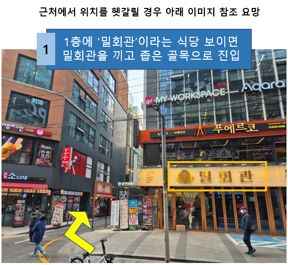 3. 밀회관을 오른쪽으로 끼고 좁은 골목 들어오면 이베리코 식당 옆에 MY WORKSPACE 라는 건물 입구가 보이며 해당 건물 엘리베이터로 9층으로(로비) 오시면 됩니다.